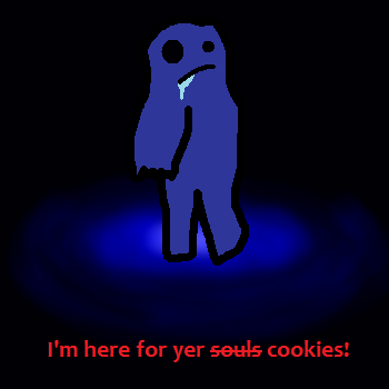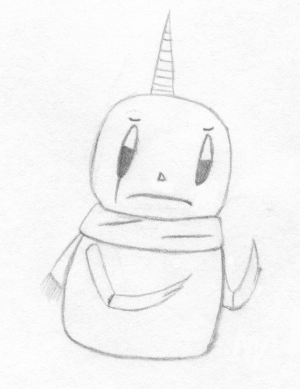 Imo (ee-mo, like Emo) the Snowman! I doodled him one day out of boredom. When he was made a carrot was put in his forehead, and a radish was used as his nose, when he started to melt a bit of the coal ran down his right cheek, leaving a little black mark in it's wake. He was then put under a spell, he could never melt no matter how hot it got, but he's a suicidal snowman, so he thinks of it as a curse.